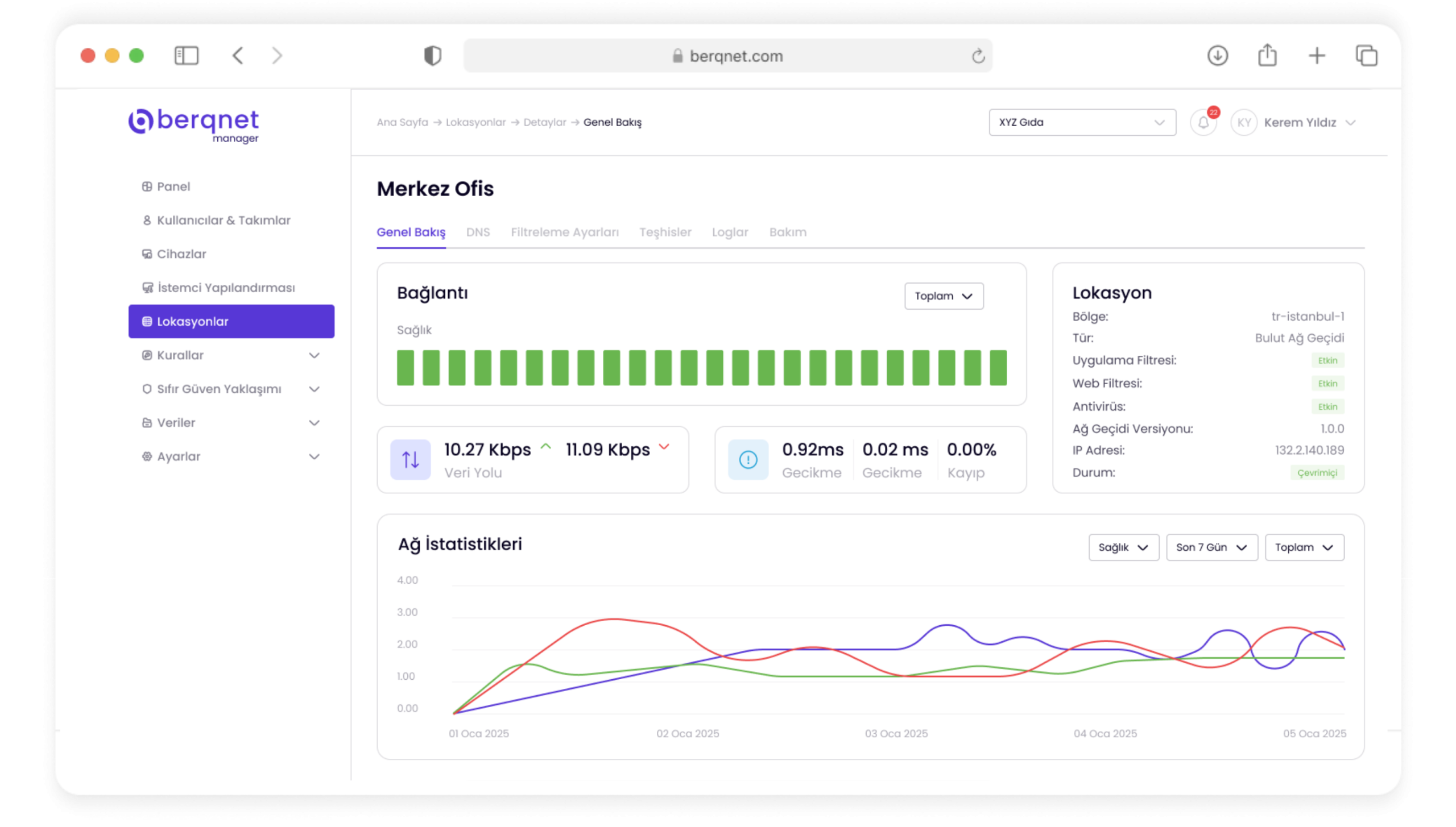 Berqnet SASE, Zero Trust Network Access (ZTNA) ile kullanıcıların ve cihazların yalnızca yetkilendirildikleri kaynaklara erişmesini sağlar. Bu, her bağlantı talebini cihaz durumu ve bağlamına göre doğrulayarak mümkün olur.