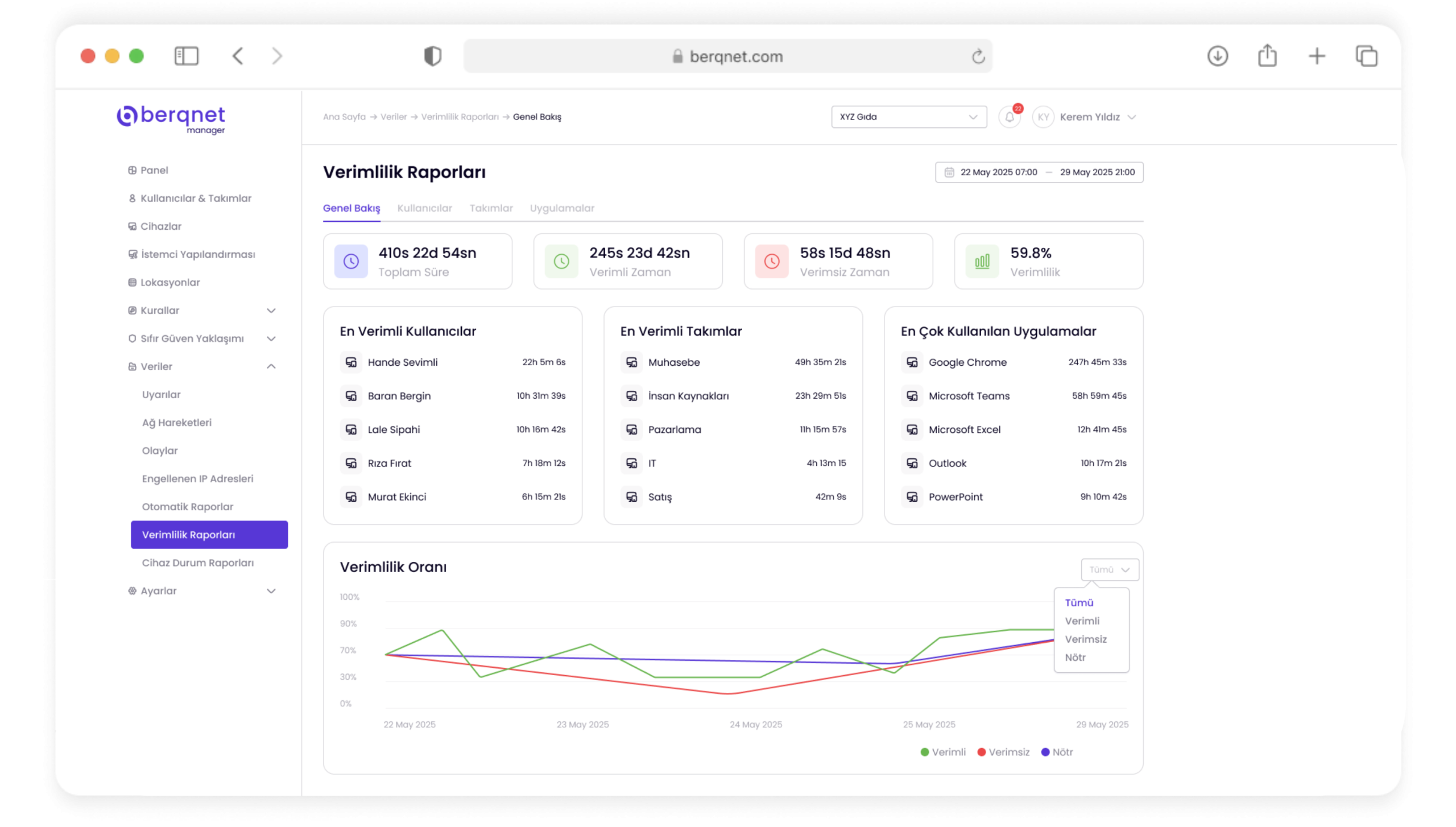 Berqnet SASE, çalışan aktivitelerini analiz ederek zaman yönetimi ve operasyonel verimliliği artırmanızı sağlar.