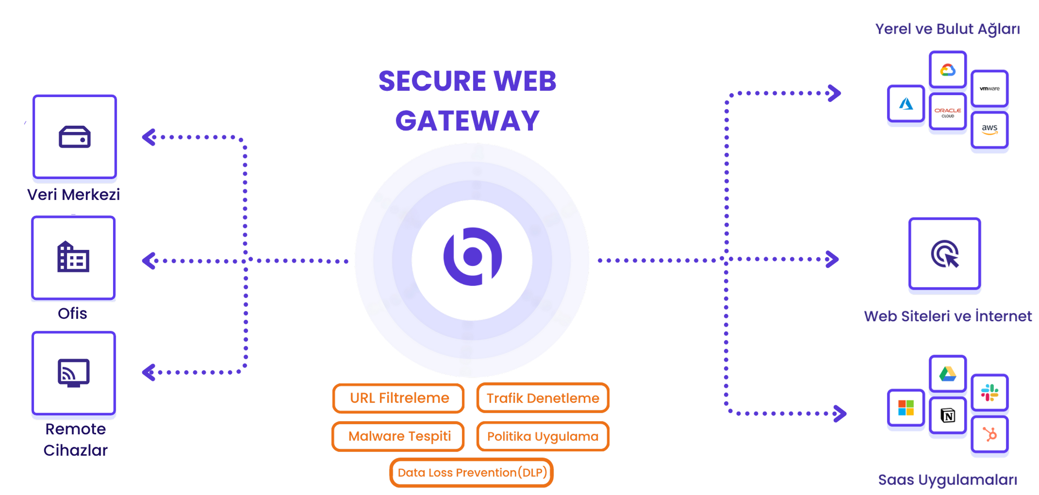 SWG, SASE’nin güvenlik katmanında kritik bir işlev üstlenir. Kurum kullanıcılarının web trafiğini denetleyerek zararlı yazılımları engeller, kimlik avı girişimlerini durdurur ve uygunsuz içeriklere erişimi sınırlar.