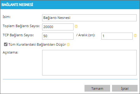 TCP Bağlantı Sayısı: Tek bir kaynak adresinin bir zaman aralığı içinde ilgili kuralla oluşturabileceği yeni TCP bağlantılarının hızını sınırlar. Bağlantı hızı, hareketli ortalama olarak hesaplanan bir yaklaşık değerdir.